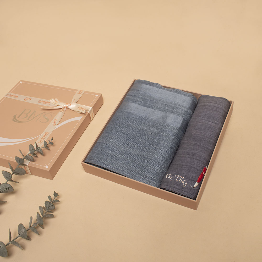 • 01 Khăn tay tơ tằm màu ghi thêu họa tiết ơn thầy size 30x30cm