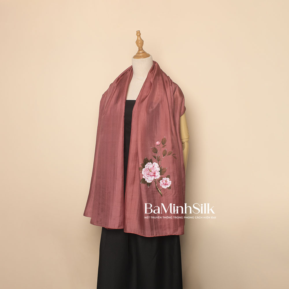 Khăn choàng lụa vẽ tay Hoa Mẫu Đơn màu hồng 85x180cm