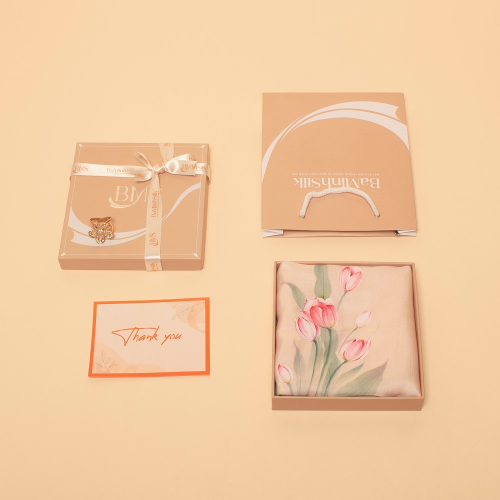- Tặng kèm khuy cài khăn, hộp, thiệp, túi giấy sang trọng.