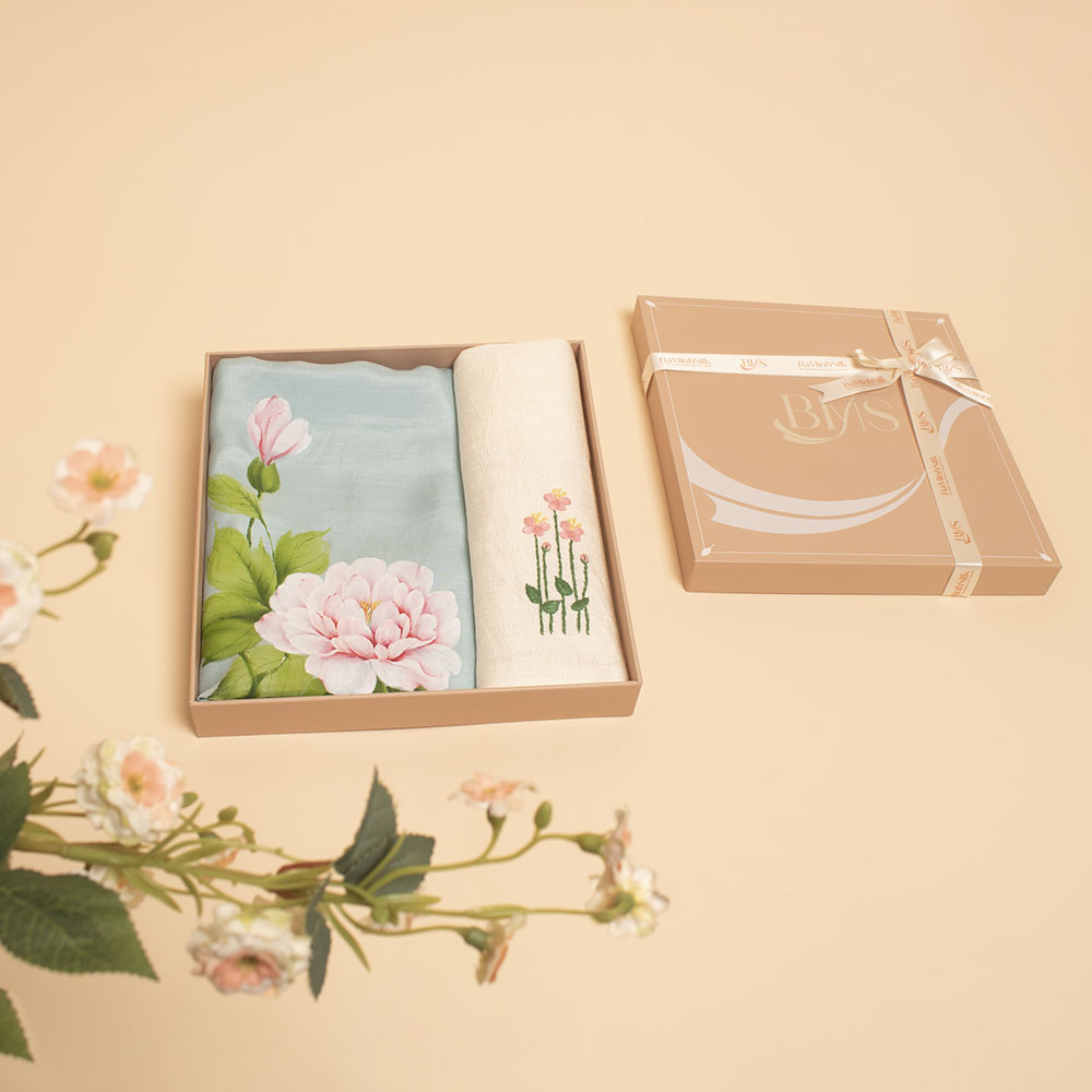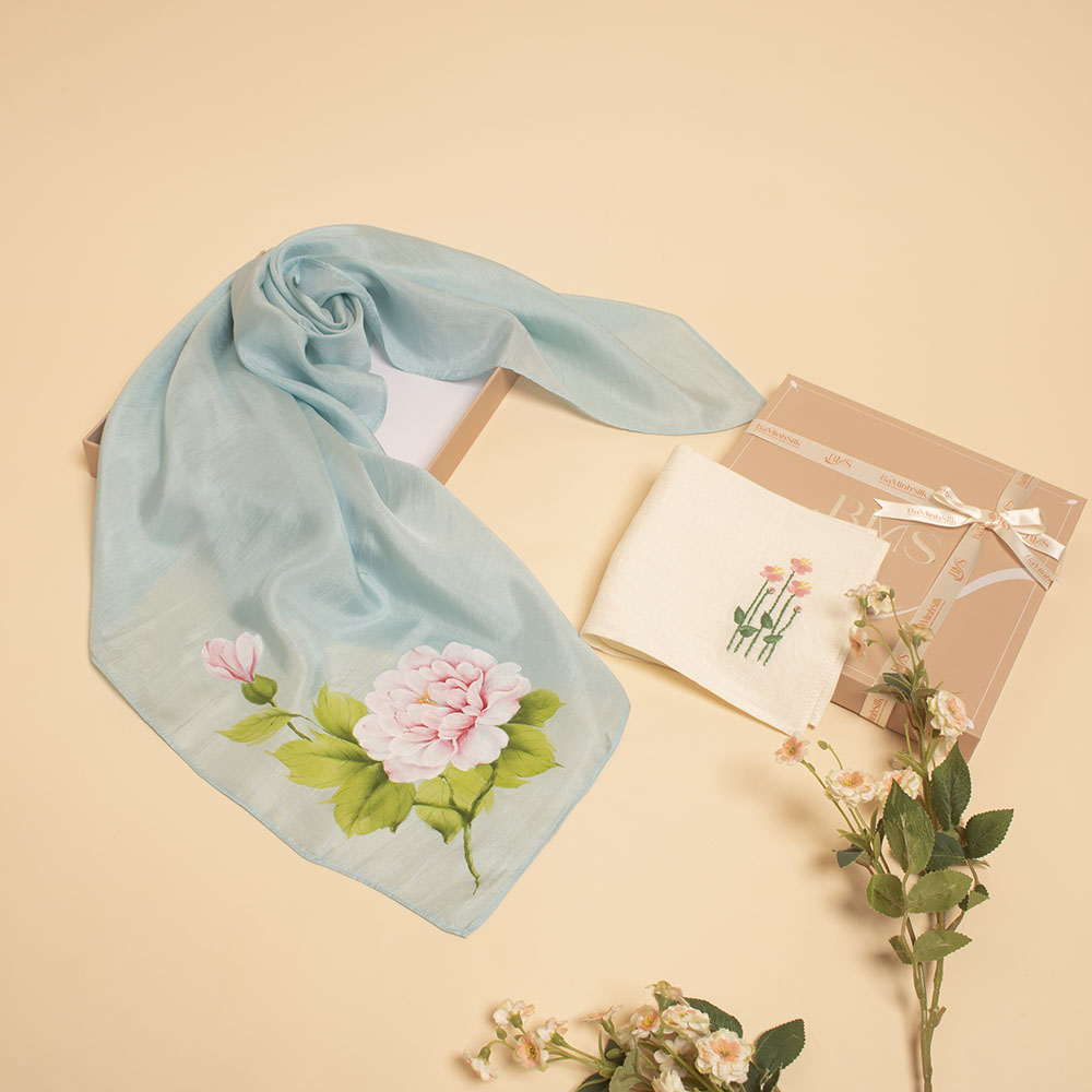 set quà 013 khăn lụa vuông vẽ và khăn tay thêu
