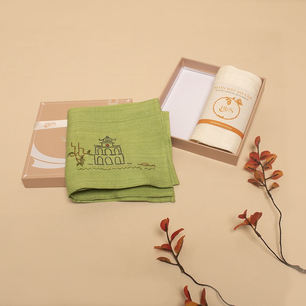- 01 Khăn tay tơ tằm xanh lá thêu Tháp Rùa size 30x30cm