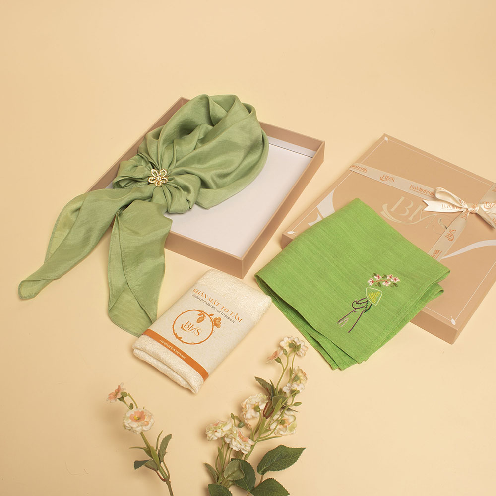 - 01 Khăn tay tơ tằm xanh lá thêu Cô gái ngắm hoa size 35x35cm