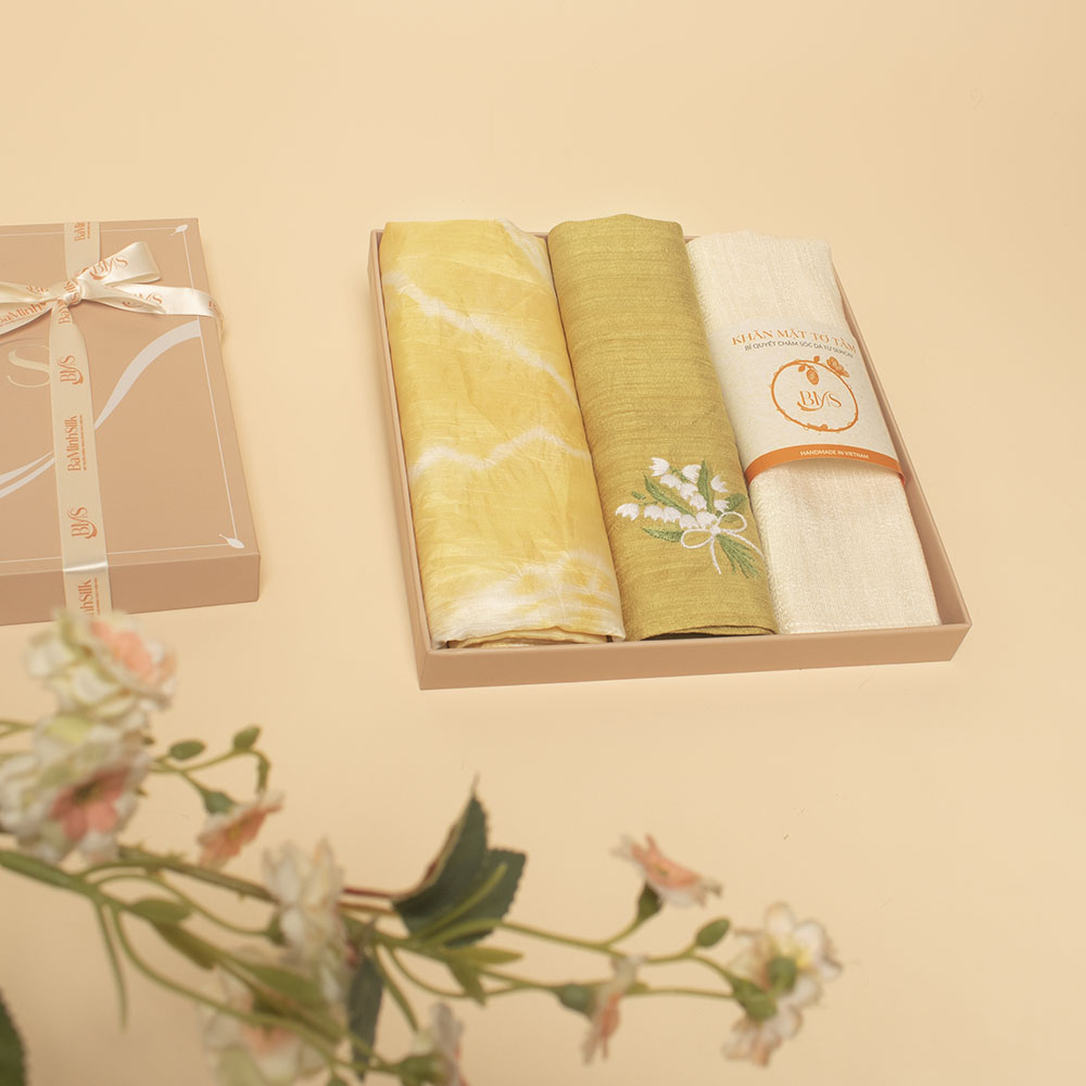 - 01 Khăn tay tơ tằm vàng rêu thêu tay họa tiết Hoa linh lan size 30x30cm