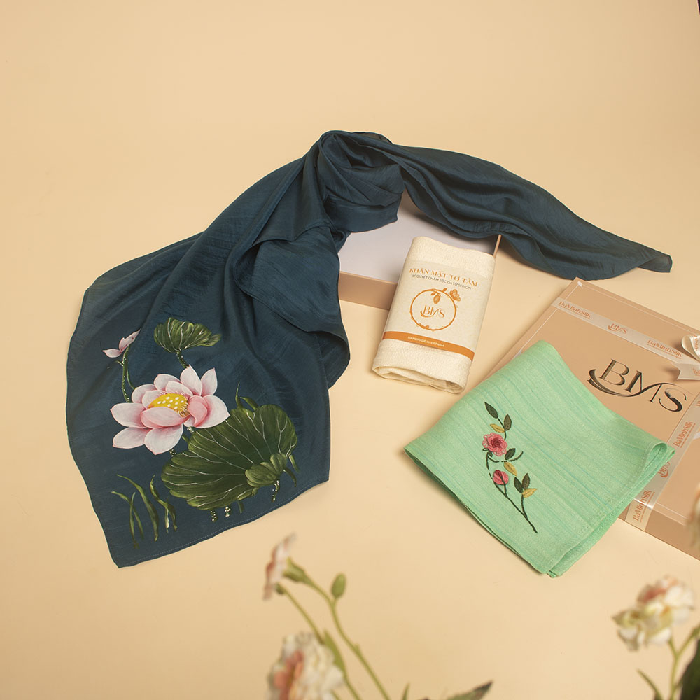 Khăn lụa tơ tằm được dệt ở làng lụa Nha Xá (Hà Nam) – nơi có truyền thống hơn 700 năm về dệt lụa tơ tằm. Hoạ tiết được hoạ sĩ vẽ tay hoàn toàn đảm bảo tính độc bản, không đụng hàng.